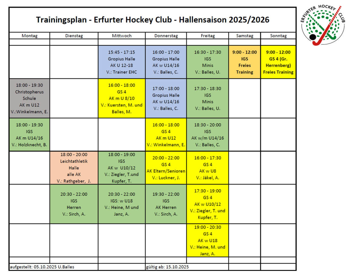 Hier findet Ihr den aktuellen Trainingsplan EHC Hallensaison 2025/26.