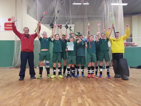 Gleich zu Beginn haben die Erfurter die Schwarz-Gelben aus Sachsen-Anhalt verrückt gemacht. Fast fünf Minuten die Eisbox sicher gehalten, bis der erste Erfurter wieder nach Vorne gesprintet ist. Am Spielfeldrand fiel die Bemerkung: „Die spielen genau wie die Erfurter Herren“. Wo das wohl her kommt? Nach den atemberaubenden Spielen unserer Herrenmannschaft in den letzten Wochen ein großes Lob! Leider konnten aber die Köthener eine Ecke zum 0:1 am Ende der ersten Halbzeit verwandeln. In der Pause musste Uwe mächtige Motivationsarbeit leisten. Die vielen Niederlagen der ersten drei Spieltage gingen sicher durch die Köpfe. In der zweiten Halbzeit stellten die Gegner ihre Taktik um, versuchten alles über links. Ben freute sich sichtlich über die Herausforderung und machte immer wieder die Schranke zu. Leider ein kleiner Fehler bei einem Angriff der Erfurter, und reaktionsschnell belohnten sich die Köthener mit dem 0:2. Unsere Jungs erhöhten den Druck. Es folgte ein spannendes Hin- und Her, und plötzlich bekam Erfurt eine Ecke. Die bewährten Schützen bereiteten sich vor. Das können wir doch! Luca gibt ein, Benedikt verwandelt seine zweite Ecke des Tages. Wir sind wieder da: 1:2! Gleich danach fiel noch ein Tor, nur leider leicht außerhalb vom Schusskreis. Kein Problem: eine Minute später fällt kurz vorm Abpfiff das 2:2. Ein Penalty-Schießen sollte den Sieger der Platzierungsrunde entscheiden. Der erste Erfurter Schuss ging bei großer Aufregung ins Aus. Zum Glück wehrte aber gleich Torwart Johannes den ersten Köthener Versuch souverän ab. Unser zweiter Penalty ging sauber rein, und Johannes konnte erneut die Köthener enttäuschen! Nur noch ein Penalty, dann haben wir es. Endstand 4:2. Erfurt ist Sieger der Platzierungsrunde!!!