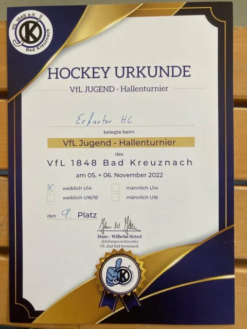 Jetzt schwanden die Kräfte von Erfurt (nur 3 Auswechslerinnen) nach diesem schweren Turnier und man musste noch zwei Tore schlucken. Am Ende gewannen die „Hausherrinnen“ und Favoriten Bad Kreuznach 2 mit 3:0 das Finale. Die EHC-Mädels hatten sich aber in diesem Finalspiel nie aufgegeben, ein tolles Hallenhockey geboten und sich selbst belohnt.