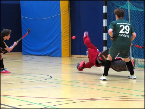 „Das Jugend B (m) Team vom Erfurter HC lieferte am 09.01.2016 den Zuschauer in der Freiberger Ulrich Rülein von Calw Sporthalle ein packendes Spiel gegen den ebenso starken Cöthener HC02, ging mit 1 : 0 in Führung, schwächelte nach der Halbzeit etwas, besann sich wieder und erreichte den Anschlusstreffer, aber nicht mehr das verdiente Unentschieden. Aber so ist das eben, davon lebt eben der Sport mit allen guten Wünschen Ihnen für die Zukunft.“