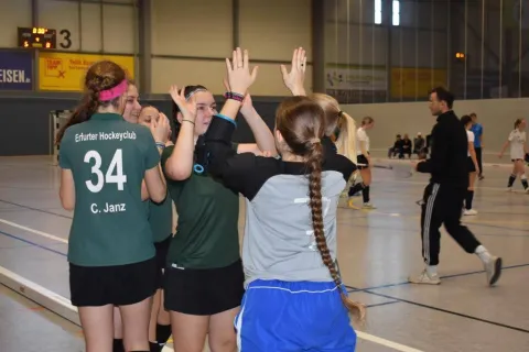 Als Sieger der Zwischenrunde B wartete als erster Gegner der Zweitplatzierte der anderen Zwischenrunde, der ATV Leipzig, auf die Mädels aus Thüringen. Der Gegner, der seine Spielerinnen aus Leipzig, Meerane und Chemnitz rekrutiert hatte, zeigte bereits in der Vor- und Zwischenrunde, dass er unbequem zu bespielen ist. Hochmotiviert und gut gelaunt nahmen sich unsere Mädels dieser Aufgabe an und erspielten sich auch die ein oder andere Chance. Während es dem EHC gelang, zwei seiner Chancen zu nutzen, konnten wir eine Ecke auf der Linie abfangen, was allerdings nicht regelkonform gelang und zu einem Siebenmeter führte. Die Erfurter Torfrau hatte bereits vor dem Spiel die Gegnerinnen gut studiert und konnte mit einer blitzschnellen Reaktion ihr Tor sauber halten. Der EHC konnte mit einer 2:0 Führung in die Halbzeit gehen. Die zweite Hälfte verlief dann dramatisch. In den ersten fünf Minuten musste der Gegner seinem aufwändigen Spiel Tribut zollen und man hatte das Gefühl das Spiel kontrollieren zu können. Es gab einige ungenutzte Chancen und schließlich eine Strafecke. Ein Ball wurde flach und hart in Richtung Tor geschlenzt, prallte aber derart unglücklich vom Schläger der herausstürmenden Verteidigerin ab, dass er eine andere Leipzigerin am Kopf traf und von dort ins Toraus sprang. Die Spielerin sank mit einer klaffenden Wunde zu Boden und musste minutenlang behandelt werden. Zum Glück blieb es wohl bei der Platzwunde und das Spiel konnte fortgesetzt werden. Der Vorfall hatte unsere Mädels und Trainer allerdings aus dem Konzept gebracht und die Gegnerinnen richtig wachgerüttelt. Den Leipzigerinnen gelang in der Folge zwar der Anschlusstreffer, das Team aus Thüringen konnte aber am Ende einen Zittersieg für sich verbuchen.